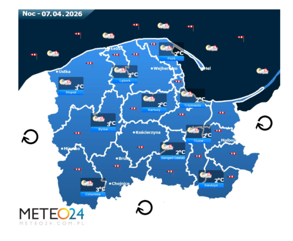 Natomiast noc z poniedziałku na wtorek i poranek na Pomorzu i Wybrzeżu nadal może przynieść silne marznące mgły lub lokalne zamglenia. W zamian tego będzie bez opadów oraz między innymi pojawi się małe i umiarkowane zachmurzenie. Temperatura powietrza wyniesie od +2°C do +3°C. Wiatr na ogół będzie silny i porywisty ze zmiennych kierunków z przewagą wiejący od zachodu i z północnego – zachodu. Dodatkowo w porywach może on dochodzić do 80-90 km/h. Ciśnienie atmosferyczne w kolejnych godzinach będzie spadać i się wahać oraz o północy na poziomie morza wskaże 1015 hPa.